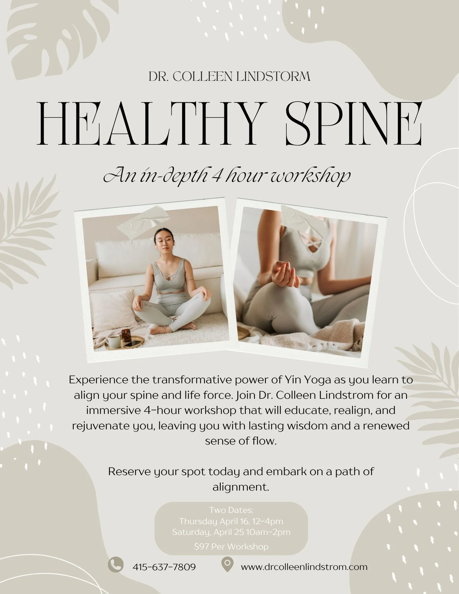 Come for the sacred experience of Yin (The Divine Feminine) Yoga with your guide, Dr. Colleen Lindstrom, DC. This class is an inward journey to soften the fascia and tendons and make space in the joints, bones, and spine. Yin has three principles: First, come into the pose to an appropriate depth. Second, relax and remain still. Third, hold the pose for time. These pillars allow for the safety and opening of these tissues. Be prepared to release blockages and increase energy flow. Adding flexibility to your body and life is always a good idea.